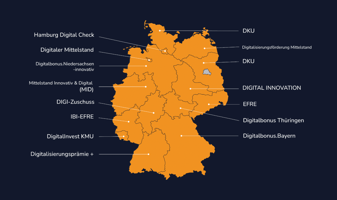 - Baden-Württemberg: Digitalisierungsprämie Plus mit bis zu 3.000 Euro Zuschuss oder zinsvergünstigten Darlehen
